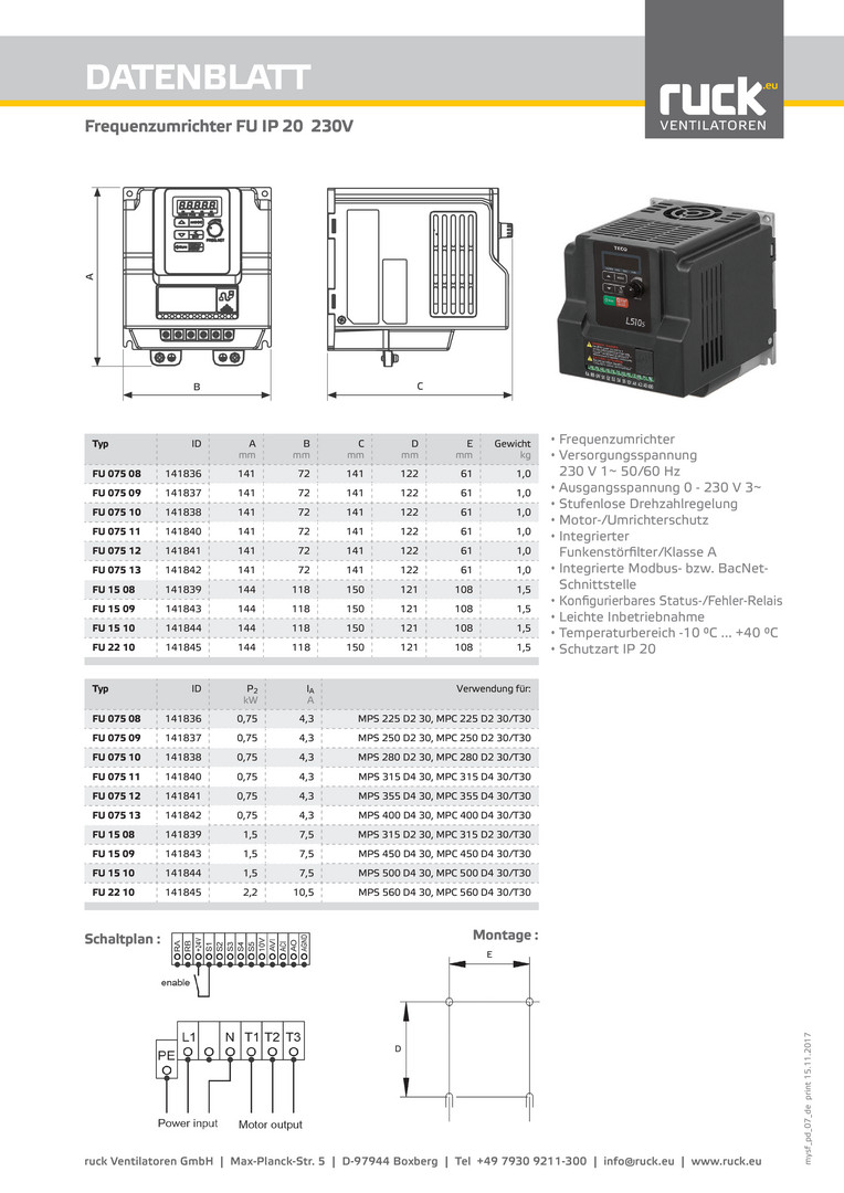 Ruck Frequenzumrichter FU 075 08mit werksseitiger Parametrierung für MPS/MPC/DVN/DVNI 225 D2 IP 20 für Schaltschrankeinbau Versorgungss pannung 230 V 1~ 50/60 Hz Ausgangsspannung 0 - 230 V 3~ Stufenlose Drehzahlregelung Motor-/Umrichte rschutz Integrierter Funkensto?rfilter/Klasse A Integrierte Modbus- bzw. BacNet-Schnittstelle Konfigurier bares Status-/Fehler-Relais Leichte Inbetriebnahme Temperaturbereich -10 °C ... +40 °C