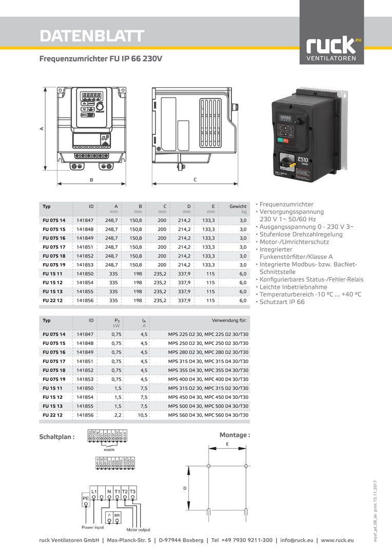 Ruck Frequenzumrichter FU 15 12mit werksseitiger Parametrierung für MPS/MPC/DVN/DVNI 450 D4 IP 66 Versorgungsspannung 230 V 1~ 50/60 Hz Ausgangsspannung 0 - 230 V 3~ Stufenlose Drehzahlregelung Motor-/Umrichte rschutz Integrierter Funkensto?rfilter/Klasse A Integrierte Modbus- bzw. BacNet-Schnittstelle Konfigurier bares Status-/Fehler-Relais Leichte Inbetriebnahme Temperaturbereich -10 °C ... +40 °C