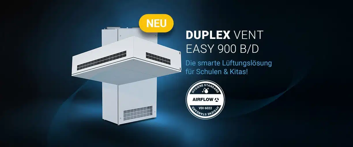 Das neue Modell ergänzt die bewährte DUPLEX Vent Easy Reihe und wird direkt unter der Decke montiert. So bleibt die Stellfläche im Raum frei – ideal für Schulen und Kitas. Durch den Coanda-Effekt verteilt sich die Zuluft zunächst entlang der Decke und mischt sich anschließend sanft mit der Raumluft. Zugerscheinungen werden zuverlässig vermieden.