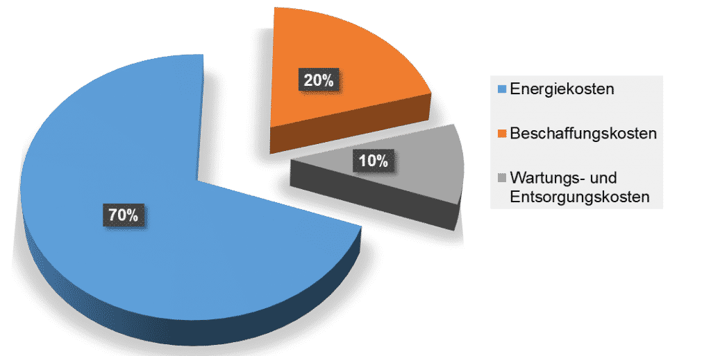 Bei Betrachtung der Total Life Cycle Costs (TLCC) wird zudem ein enormes Einsparungspotenzial deutlich. Energiekosten schlagen mit ganzen 70 % nieder, Beschaffungskosten mit einem Anteil von 20 %, und Wartungs- und Entsorgungskosten nehmen kaum 10 % ein.